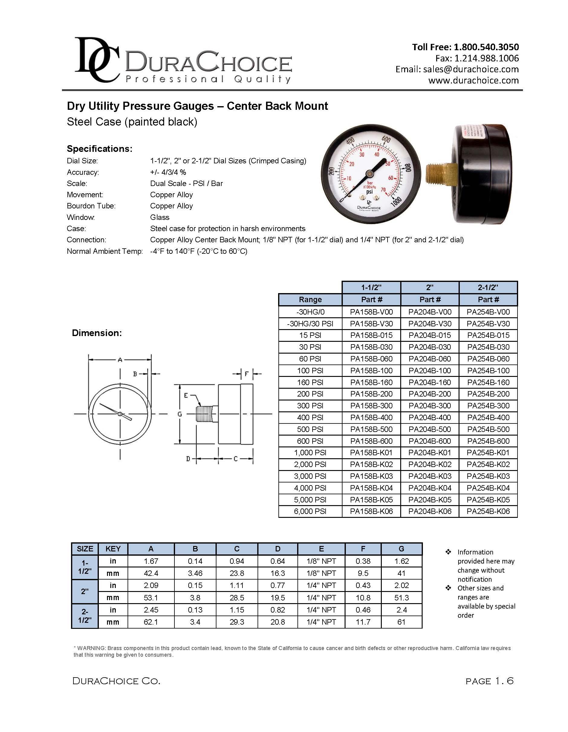 DuraChoice Brand Dry Utility Gauges are some of the best in the business. Wrapped in a black steel case and featuring a glass window, these dry gauges are as rugged as any in the market today at a fraction of the cost. Our selection ranges from vacuum to 6,000 PSI (WOG). These gauges can be used to measure pressure in water, oil, gas and diesel, among other media. DuraChoice dry gauges are designed with visibility in mind. The dual scale gauges are highly legible, with black and red numbering on a white face.