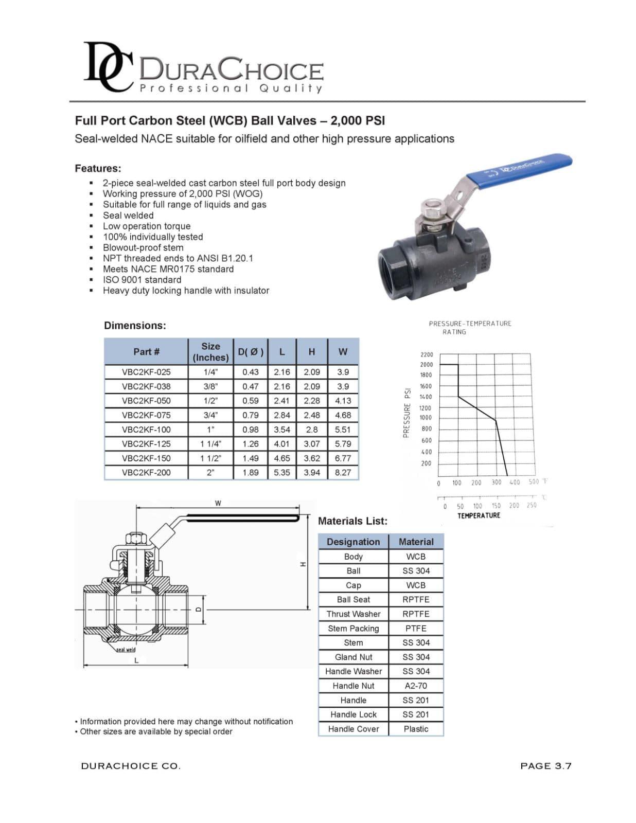 The DuraChoice VBC2KF has a seal-welded full port design made for high pressure applications like oilfield or other petroleum work. The full port minimizes cavitation and fluid separation, while the valve's make-up is formulated to resist corrosion caused by oil and natural gas production.