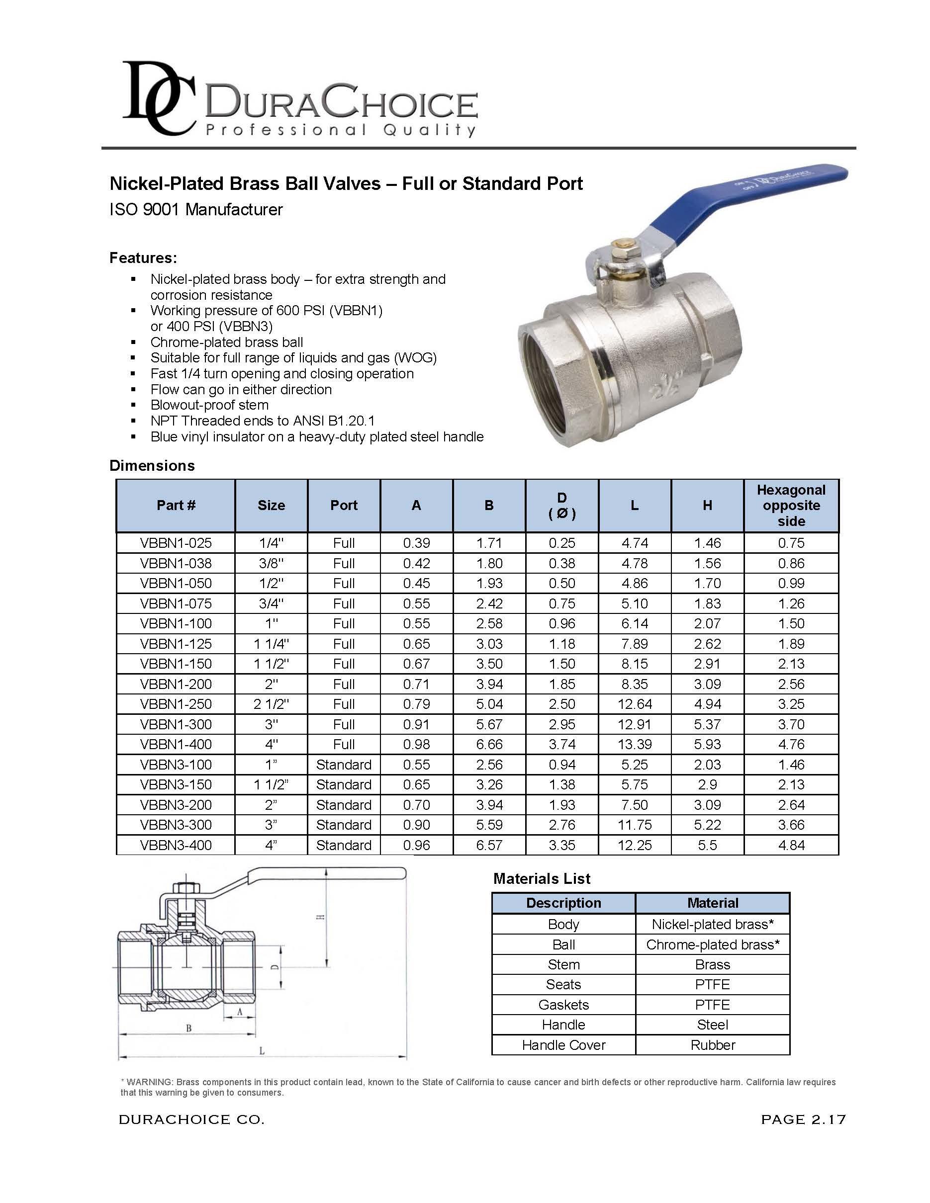 DuraChoice Full Port Nickel-Plated Brass Ball Valves offer greater corrosion resistance over normal brass ball valves. The 600 PSI (water, oil and gas) full port size reduces both cavitation and pressure drop. They feature a blowout-proof stem and a easy-turn handle. NOT FOR POTABLE WATER